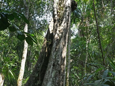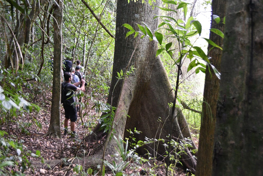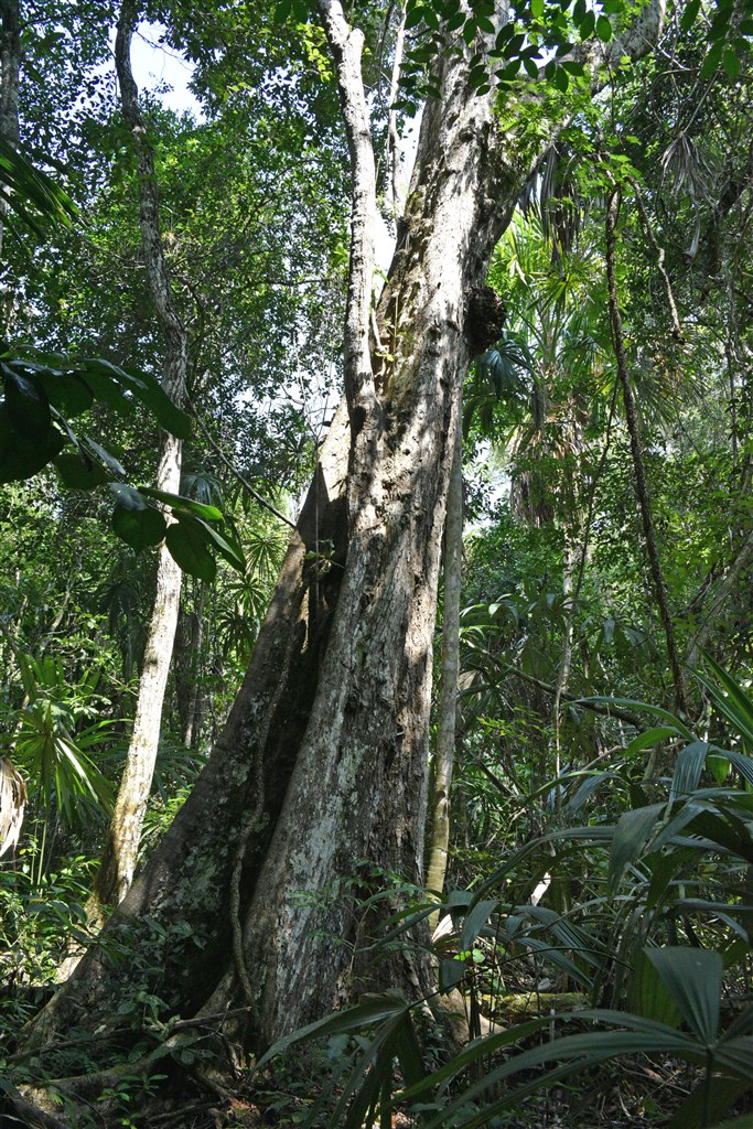 Dopoledne rychle uteklo, jsme zmoženi množstvím zážitků, napjatým sledováním výkladu, lezením na vrcholky starých pyramid hustě porostlých vegetací. Po obědě, kterého se na výtečnou zhostil náš kuchař, držíme chvíli siestu. Nicméně je třeba ještě překonat asi 12km do dalšího tábora. Široká cesta, pro archeology, skončila, dál vede úzká pralesní stezka, udržovaná jen mačetami našich indiánských průvodců. Plnými doušky si užíváme nejen průstupu pralesem, ale bohaté ukázky a vysvětlivky našeho specialisty na přírodu Antonia. V oblasti bylo nalezeno více jak 125 rostlinných druhů, v šesti různých habitatech. Vysoký les dosahuje více jak 30m a porůstá vápencovou pahorkatinu. Nápadný strom představuje Sapodilla (Manikara zapota) produkující vedle sladkých plodů surovinu chicle. Z tropického stálezeleného stromu vytéká mléčná šťáva, ze které následným srážením vzniká růžovo-červeno-hnědá guma. Chicleros (sběrači) chodí do pralesa a řežou široké „V“ zářezy do kmene sapodilly z výšky asi 10m směrem k zemi. Mléko z ran teče dolů po kmeni do nádoby u země. Nařezání často strom zabije a sklizeň má za následek vyčerpání sapodillových lesů. I když strom přežije první nařezávání, životnost stromu pro sklizeň čikletu je kolem 10-ti let. Chicle se stal dobře známým jako hlavní přísada do žvýkaček. Dnes jsou naštěstí žvýkačky vyráběny převážně ze syntetických zdrojů.