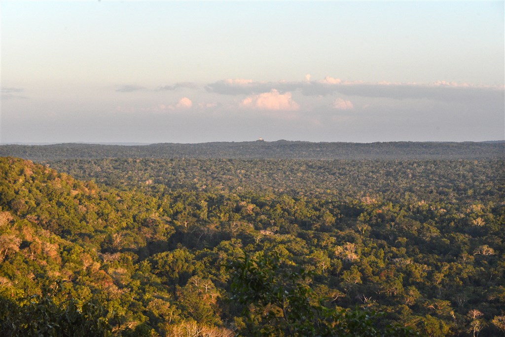 Další tábořiště nelze ani nazvat mýtinou, je to jen prosekaný kousek pralesa se vzdušnou zastřešenou kuchyní a velkou střechou na kůlech, pod kterou se staví stany. Campamento stojí na hranicích národního Parku Tikal, zároveň zde končí biotop San Miguel La Palotada. Přímo nad tábořištěm se dá cestou necestou vyšplhat strmým úbočím vápencového hřebene na vyčnívající skálu, převýšení činí asi 150m. Skála nabízí všem, kdo martyrium podniknou, odměnu v podobě nádherné vyhlídky. Je odtud vidět zpět pyramida El Diablo, laguna Palmar, která je jinak utopená v pralese a držte se pevně - i pyramida-Chrám IV v Tikalu. Vše je nasvíceno pastelovými barvami zapadajícího slunce. Kdo někdy klopýtal pralesem, jakoukoliv vyhlídku ocení, protože celé dny, kromě zeleného pekla nevidí nic. Tento Mirador je tak otevřený, že si konečně dokážu udělat naprosto jasnou představu o topografii procházeného území. Především lze uchopit pojem údolí Buanavista – jde o velmi ploché, široké údolí, takže kdyby ho člověk nespatřil z výšky, bude mít spíš pocit jakési rozlehlé ploché pánve. To je i důvod, proč se přirozený přírodní koridor mezi východem a západem Yucatanu mění v období dešťů na obtížně průchodné bažiny. Kdesi v dálce na západě lze tušit vesnici Dos Aguadas, odkud jsme vyrazili. Lépe identifikovatelná je poloha El Zotz a Tikalu, jehož mohutný Templo IV se zdá takřka na dosah ruky, i když je to ještě asi 20km na východ. Mám příjemně uspokojivé mrazení v zádech z faktu, že si dovedu přesně představit trasu tažení Siyaj K´aka a odhadnu, proč si ji vybral. Být v jeho kůži, vedl bych invazi stejně.