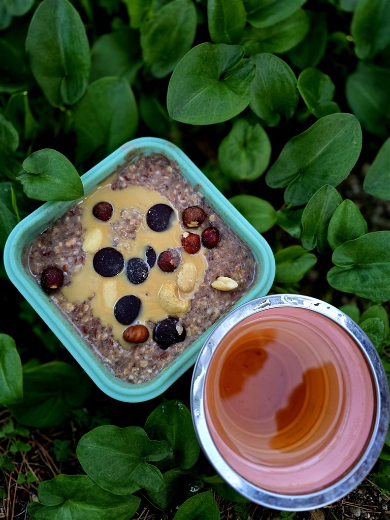 pohankové/jáhlové/rýžové vločky/instantní kaše (stačí zalít vařící vodou a doplnit oříšky atd.)