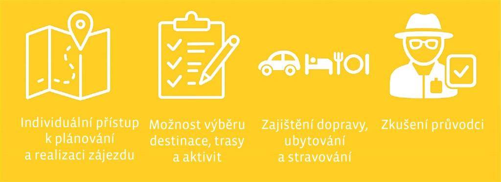 Vyměňte katalog za zážitek. Stačí nám říct, kolik vás bude, kam vás to táhne a co byste si přáli zažít – a my už to poskládáme. Vymyslíme program na míru, zařídíme dopravu, ubytování i jídlo a přidáme průvodce, který se v terénu neztratí. Minimum je 7 osob na zájezd. Vyrazte jinam, než kde už byli všichni ostatní.