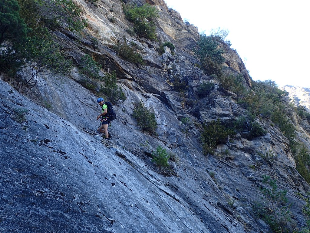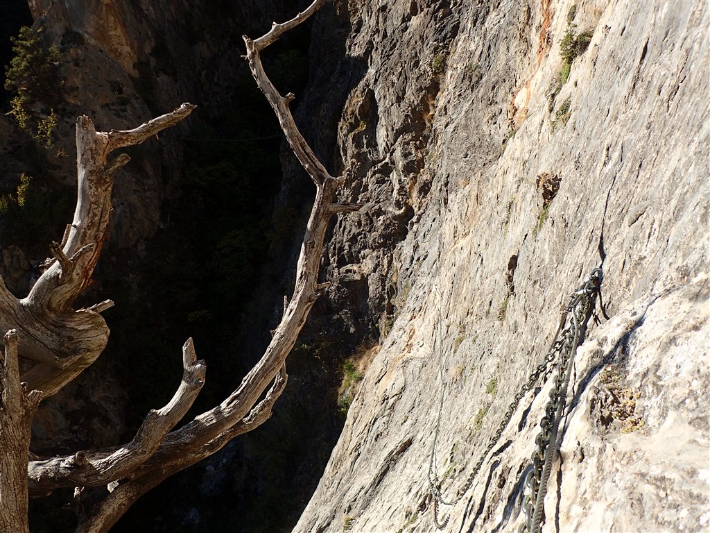 9: den: 1.ferrata - první část vede po skalní stěně, která je téměř kolmá, vzdušná, cca 80m vysoká skalní stěna pouze s občasným použitím umělých stupů a větší část se leze po stupech přírodních a přichycuje se řetězu, terén exponovaný, jištění dobré. 2.ferrata trochu lehčí, zážitková. Sestupový terén od 2.ferraty náročnější.