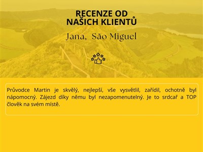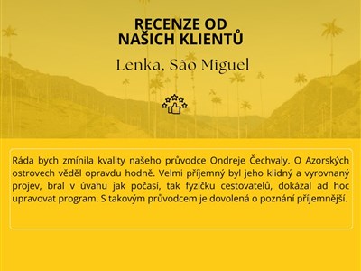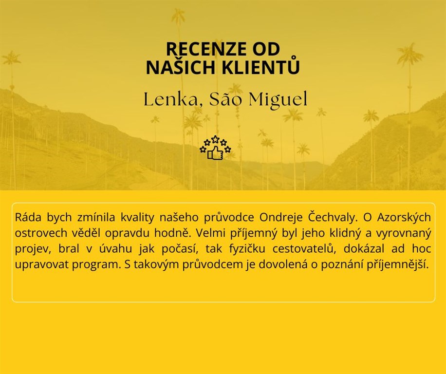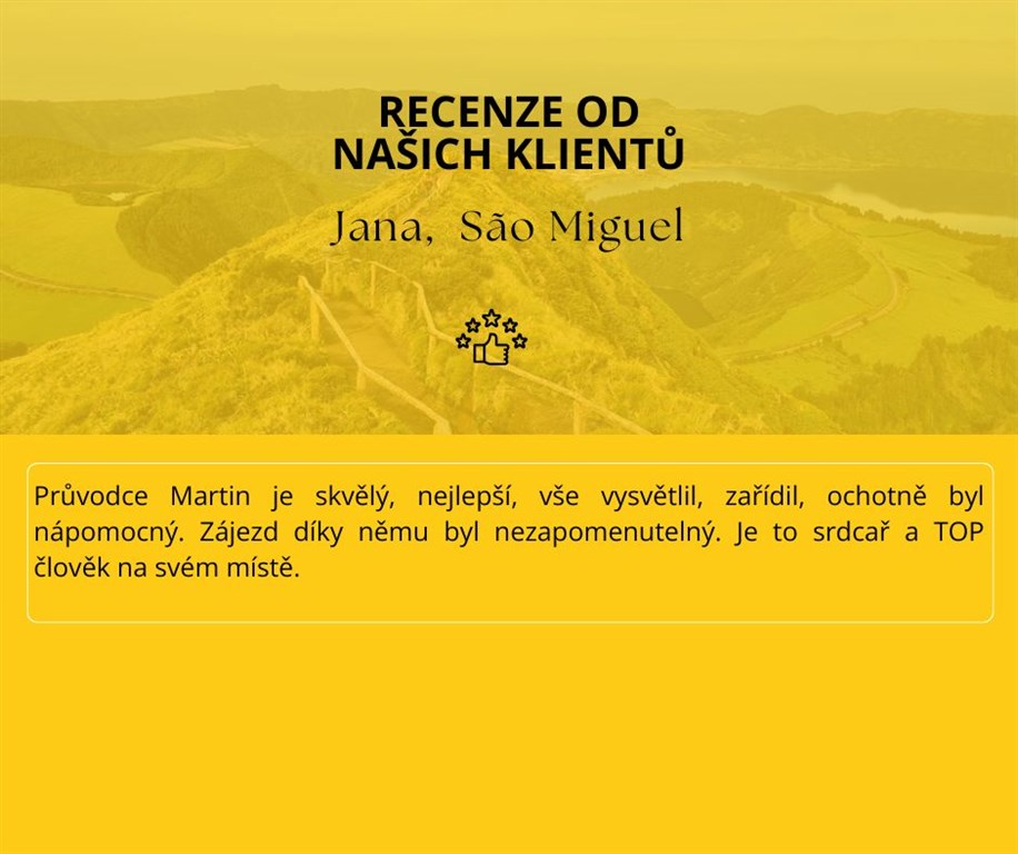Volnější den, který strávíme dopolední návštěvou bývalého hlavního města VILA FRANCA DO CAMPO a navštívíme honosnou poutní kapli Nossa Senhora da Paz se schodištěm zdobeným typickými azulejos. Zajdeme na výtečný místní zákusek Queijadas da Vila do Morgado a zbude-li čas, vykoupeme se v moři. Odpoledne se cestou domů zastavíme na vyhlídce u sopečného jezera Lagoa do Fogo a za dobrého počasí můžeme sejít k jezeru severní stranou nebo se dokonce podél jeho břehu projít (↔7,7 km, 3 hod, ↓130m, ↑130m).