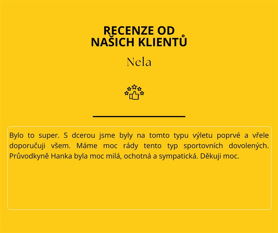 Děti do 14 let (včetně) mají na zájezd 10 % slevu.Vybavení na ferratyNa ferraty je pro dospělého naprostou nutností přilba, sedací a prsní úvazek a tzv. ferratový set (2 speciální karabiny s pádovou brzdou) a plochá nesešitá smyčka o délce cca 150 cm (slouží ke spojení sedacího a prsního úvazku). Pro děti do 140 cm a 40 kg je nutností tzv. celotělový úvazek pro dítě včetně přilby a dětský ferratový set. Mějte na paměti, že bez tohoto vybavení nemůžeme na ferratu nikoho pustit! Vhodným a doporučeníhodným doplňkem mohou být i celoprsté ferratistické rukavice (popř. cyklistické). Pokud si ferratový set pro děti budete rezervovat v naší půjčovně, je potřeba do poznámky napsat výšku a váhu dítěte. Pokud nemáte vlastní vybavení, můžete si jej zapůjčit v naší kudrnovské půjčovně (krom rukavic) a budete ho mít připravené na místě u průvodců. V případě, že není možné v objednávce objednat dětský ferratový set, poptejte si ho prosím přímo na naší prodejně zájezdů a my se jej pokusíme zajistit v externí půjčovně.Skupina a průvodceJedná se o komorní akci pro skupinku max. 10 účastníků a 1 zkušeného průvodce. Jedině tak je možné zajistit maximální bezpečnost a individuální přístup.Cestovní dokladyDo Rakouska nám stačí platný občanský průkaz. Ostatní podrobné pokyny k zájezdu (tzv. rodokaps) obdržíte v dostatečném předstihu tak, abyste se mohli na zájezd v klidu připravit. Nejpozději však týden před odjezdem.