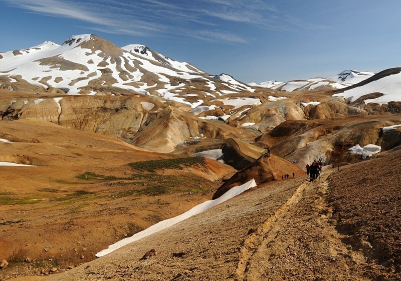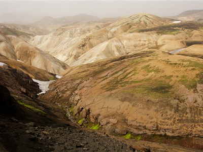 Dle chuti a nálady výběr z několika kratších i delších turistických okruhů v termální oblasti "Duhových hor" Landmannalaugar. Za pěkného počasí podnikneme delší výlet do oblasti termálních pramenů a obsidiánových hor v oblasti kolem vrcholu Brennisteinsalda. Neomezeně jsou k dispozici místní přírodní lázně, v podobě horké říčky, tekoucí hned vedle našich stanů. (↔ 5-16 km, ↑ 520 m, ↓ 520 m)
