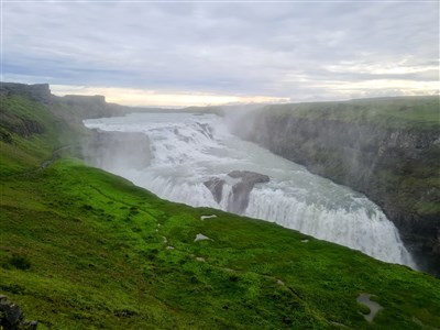 Mocný vodopád Gullfoss zahalený do oblaku vodní tříště.