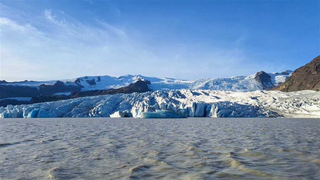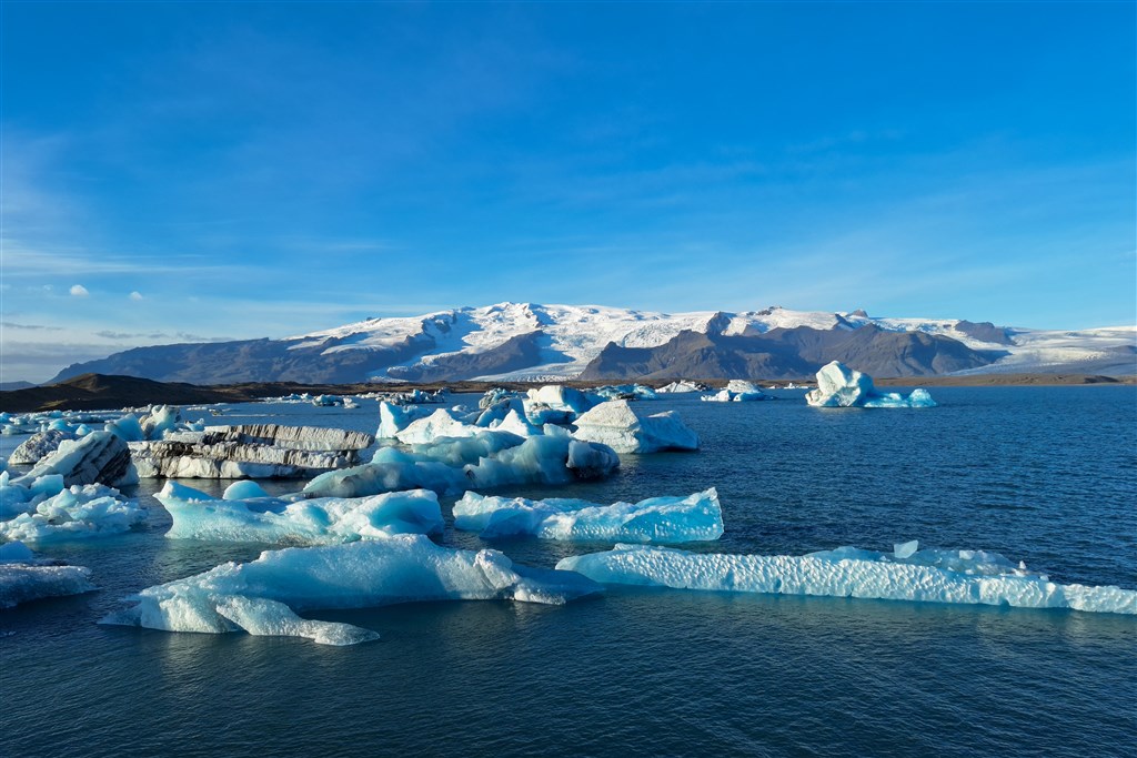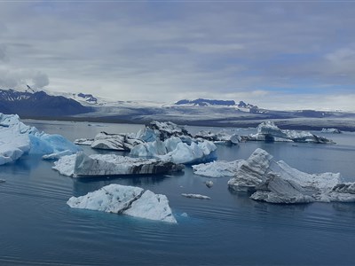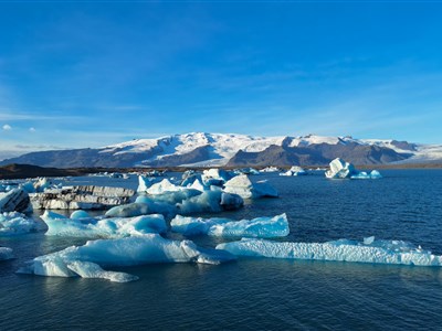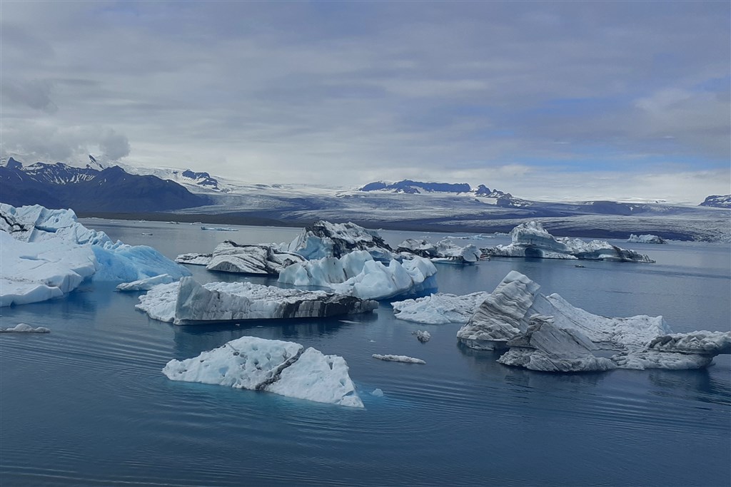 Masivní ledové kry na laguně Jokulsárlón odrážejí majestátnost masivního ledovce v pozadí.