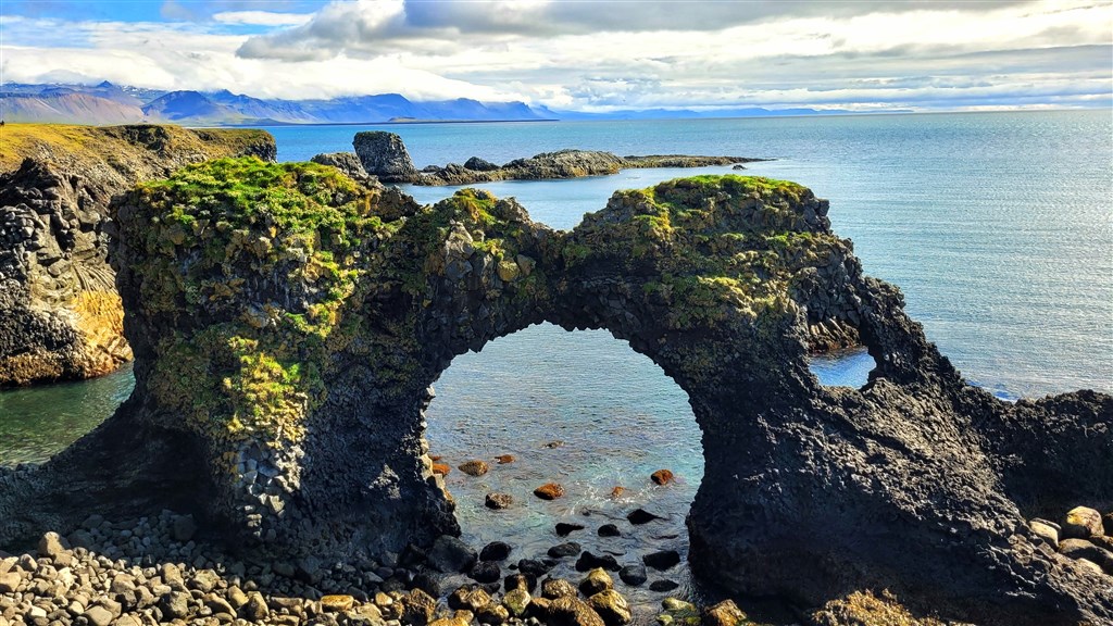 Dokonalý skalní oblouk Gatklettur na pobřeží poloostrova Snaefellsnes, kde se moře proplétá mezi dramatickými skalami.