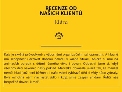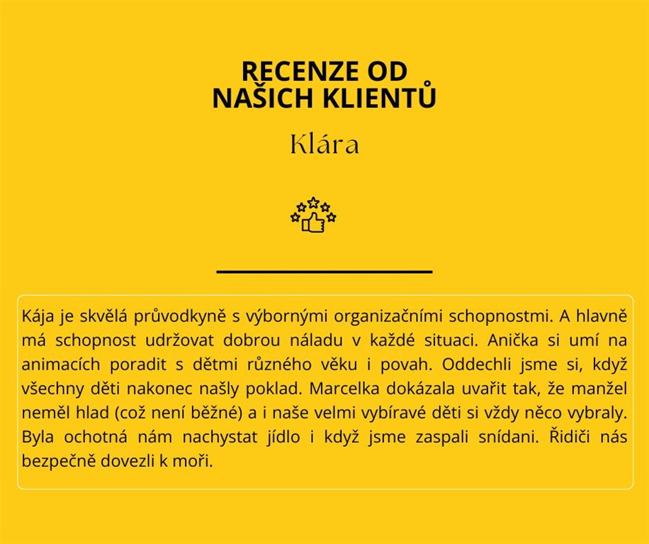 Prověřená taškařice pro rodiče, prarodiče, nerodiče a jejich ratolesti do věku 15 let. Krom spousty her, soutěží a koupání zajedeme i na raftovačku, vyplujeme na moře za ,,rybolovem“ i vyšplháme na okolní kopce s dalekými výhledy na Jadran. Nebude chybět ani zručný průvodce + organizátor taškařic, eventuelně i večerní hlídač dětí. Tento zájezd je zaměřený především na koupání a letní pohodu. Obden vyrazíme naším busem na výlety po přírodních i historických perlách (všechny tyto výlety jsou již v ceně zájezdu). Volné dny vyplníme fakultativními radovánkami v okolí – půjčování lodí i kol, pingpongové stoly, volejbal, lety na padáku, vodní lyže, trampolíny, plovoucí nafukovací prolézačky pro děti, plážování u moře, rafting nebo pohodová jízda po řece Cetině a další.