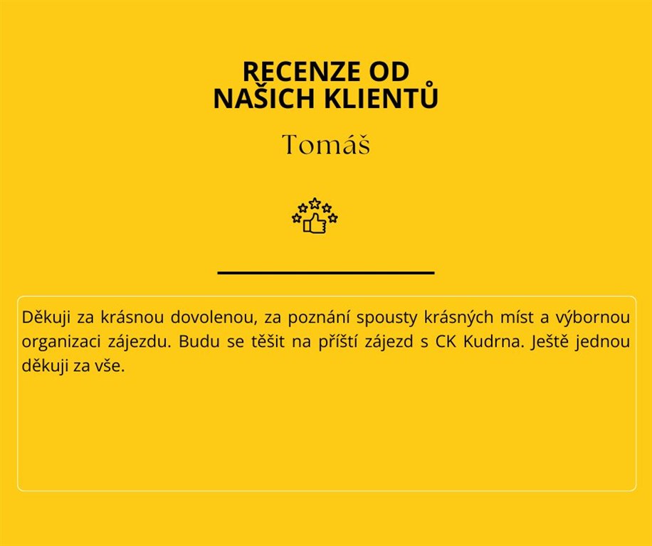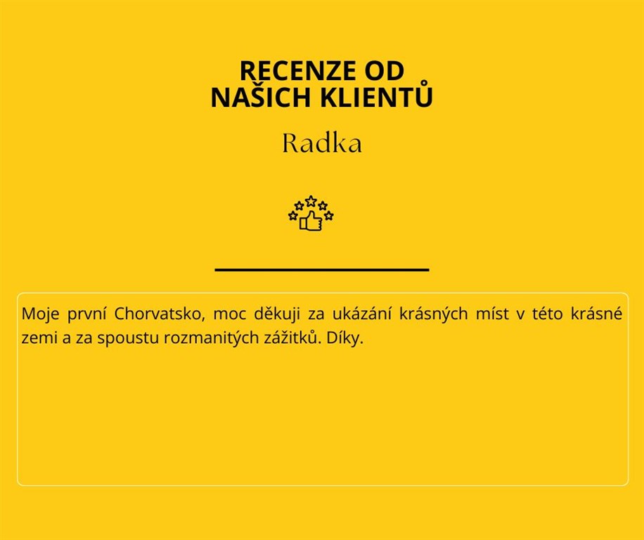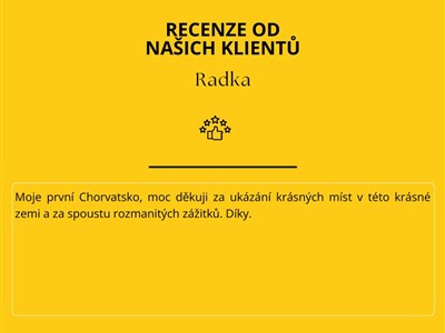 Speciální dětská sleva na tento zájezd2.000 Kč za každé dítě do 14 let včetně.Doporučené kapesnéDoporučujeme mít u sebe minimálně 250,- EUR/os. v případě, že chcete absolvovat všechny v programu zmíněné požitky.Cestovní dokladyDo Chorvatska stačí platný OBČANSKÝ PRŮKAZ.Ostatní podrobné pokyny k zájezdu (tzv. rodokaps) obdržíte v dostatečném předstihu tak, abyste se mohli na zájezd v klidu připravit. Nejpozději však týden před odjezdem.