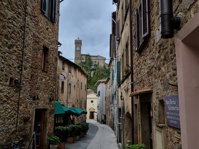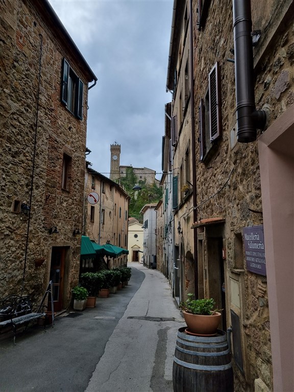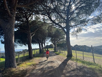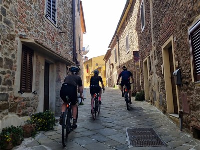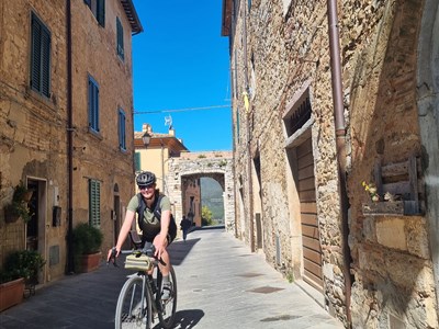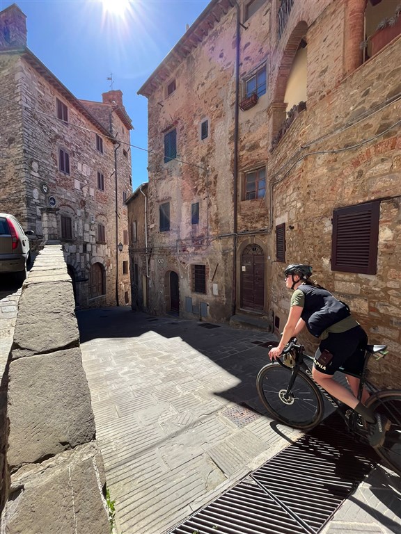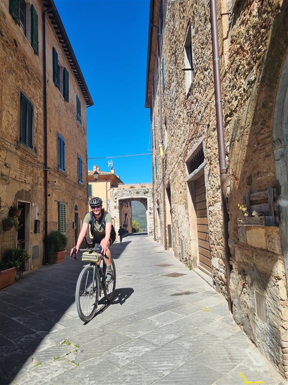 Etapa s výrazně kopcovitým profilem, vedoucí po klidných vedlejších silnicích a šotolinových cestách mezi zahrádkami a pastvinami. Po sérii kratších výjezdů nás čeká ostré stoupání do malebné kamenné vesnice Roccatederighi, která je známá svými oslími závody i parádními vyhlídkovými spoty. Závěr etapy nabízí delší šotolinový sjezd s možností zajížďky do Scarlina na kávu nebo drobný nákup. Celkově náročnější, ale rozmanitý den plný kontrastů – od táhlých výjezdů až po technický sjezd lesem.🛣️ 92 km | ⬆️ 1 288 m |