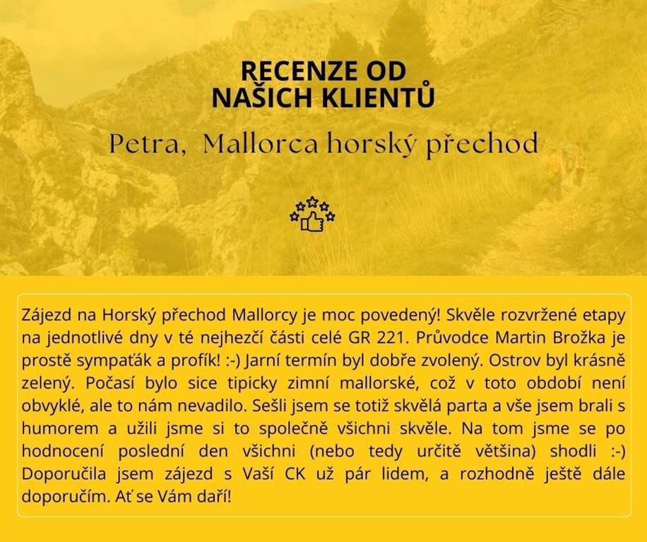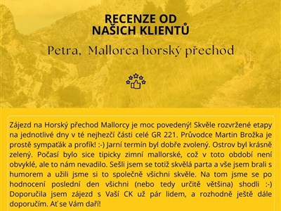 Španělský ostrov Mallorca si leckdo představí jako plážový ráj ve Středozemním moři. Málokdo už ale ví, že tento ostrov s průměrně 300 slunečnými dny v roce nabízí aktivnějším turistům mnohem víc. Celou severní část ostrova zaujímá téměř 90 km dlouhé, vápencové pohoří Serra de Tramuntana, které bylo nedávno zařazeno na seznam přírodních památek UNESCO. Hory jsou protkány desítkami kilometrů stezek, které vedou od pomerančových a mandloňových sadů v údolích až po nejvyšší vrcholky. Ty sice nedosahují takových výšek jako třeba v Alpách nebo Pyrenejích, zato se zvedají přímo z moře a formují impozantní horské kulisy lemované divokým pobřežím. Podnikneme 6 denní trek po tzv. „Stezce suchých kamenů“ v centrální části pohoří Serra de Tramuntana. Půjdeme na polotěžko (jen s lehkým spacákem, nocleh na chatách s možností polopenze), nocovat budeme vždy pod střechou na útulných horských chatách. Tento zájezd si užijete díky leteckému přicestování a pohodlným přesunům místní dopravou.