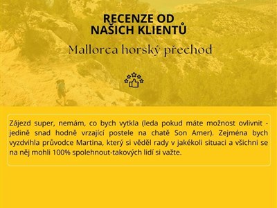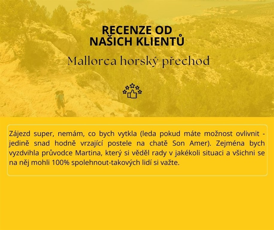 ZavazadloJednoznačně doporučujeme dobrý batoh, do kterého se vám vše pohodlně vejde a který se dobře nosí. Vzhledem k ubytování na horských chatách je optimální objem cca 40 l.SkupinaTento zájezd je určen pro komorní skupinu, maximální kapacita je 14 účastníků + 1 průvodce.KapesnéDoporučujeme mít u sebe alespoň 250 EUR/osobu na dokupování potravin, posezení v místních hospůdkách, na vstupy do památek, pohledy, suvenýry, ale hlavně jako krizovou rezervu.Cestovní dokladyPro cestu na Mallorcu nám stačí platný občanský průkaz.Ostatní podrobné pokyny k zájezdu (tzv. rodokaps) obdržíte v dostatečném předstihu tak, abyste se mohli na zájezd v klidu připravit. Nejpozději však týden před odjezdem.
