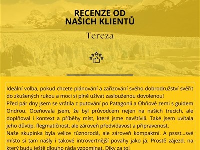 Autobusem přejedeme přes hranice do chilské jižní Patagonie do města Puerto Natales. Odpolední procházka městem, ležícím na březích zálivu „Poslední naděje“. Následující den se vydáme na jednodenní výlet do národního parku TORRES DEL PAINE. Podnikneme několik kratších vycházek na vyhlídky a k vodopádům. Pokud budeme mít štěstí na počasí, otevřou se před námi úžasné výhledy na masivy věží Torres, ikonické „rohy“ Cuernos i masiv Paine Grande v popředí s blankytně modrým jezerem Nordenskjold a tyrkysovým Pehoé.