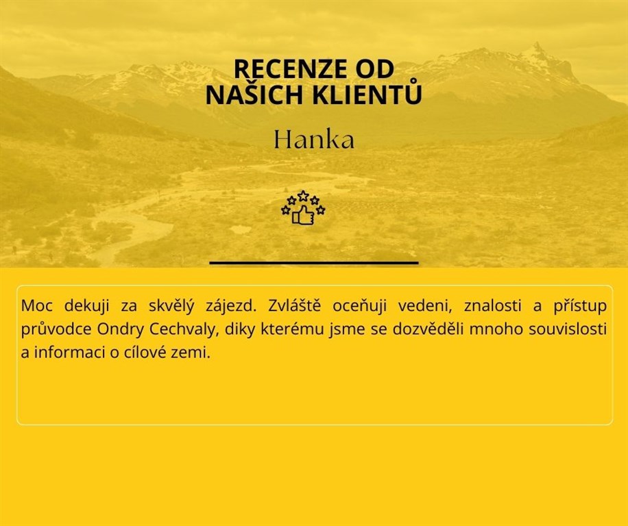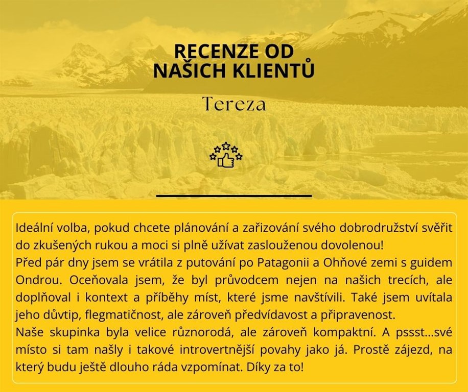 Přesuneme se do městečka El Chaltén, které je centrem severní části NP LOS GLACIARES a bude naší základnou pro výlety do národního parku proslulého kultovními horami CERRO TORRE (3.102 m) a FITZ ROY (3.405 m). Během jednodenních pěších výletů se k nim přiblížíme téměř na dosah. Se zájemci pak vystoupáme až k Lago de los Tres, přímo pod mohutným žulovým monolitem Fitz Roy i na vyhlídku Maestri pod skalní věží Cerro Torre, která je noční můrou i nedostižným snem horolezců z celého světa. Denní trasy do 25 km. Cesty jsou velmi dobře značené, lze si tedy trasu individuálně zkrátit/prodloužit. Poslední den večer se vrátíme do El Calafate.