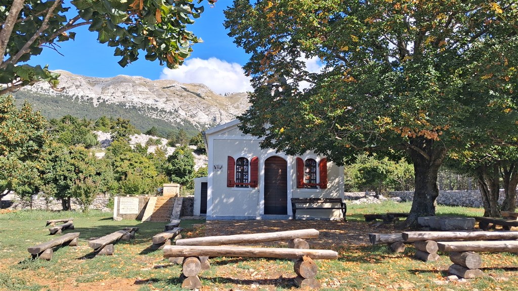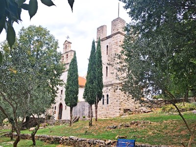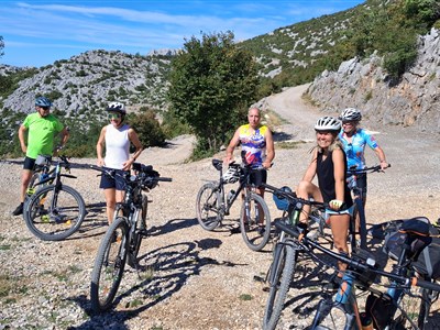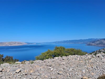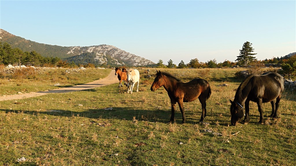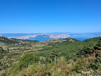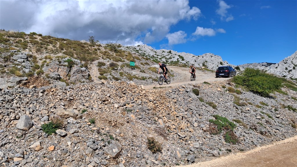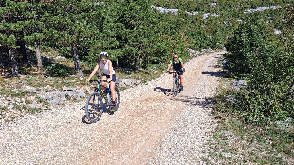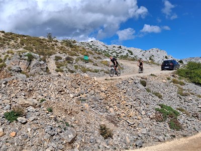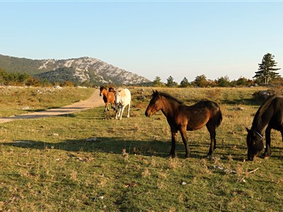 Výjezd ze Stariho Gradu na Veliko Rujno. Starý kostelík uprostřed hor, salaše, polodivocí koně a zasloužený sjezd zpátky k Jadranu. (↔ 23 km ↕ 900, cca 10 km šotoliny)