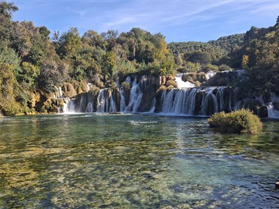 Na kole národním parkem KRKA. Antická lokalita Burnum, travertinové vodopády Roški Slap a Skradinski Buk. Pravoslavný monastýr Krka. (↔ 30-38 km ↕ 600 m, fakultativně 8 km šotoliny)