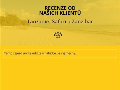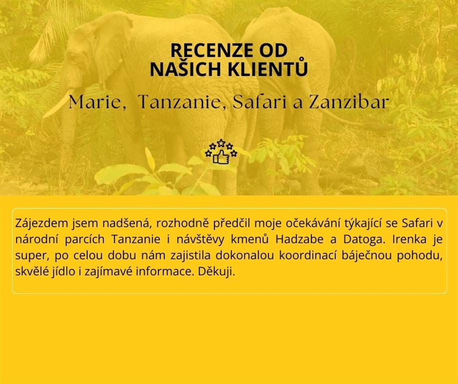 Tanzanie - krajina poseta elegantními akáciemi, majestátnými baobaby a nekonečnou romantikou savany, hlazená kopyty divoké zvěře a prohřátá úsměvy Masajů. Zanzibar – bílá perla Indického oceánu provoněná hřebíčkem a muškátovým oříškem, gastronomická katarze a křižovatka kultur.V Safari části v NP Tarangire budeme pozorovat slony, lvy a žirafy, a západ slunce si vychutnáme v bazénku s výhledem na úchvatný park Lake Manyara, přezdívaný ptačí svět. Poté se přesuneme nekonečnými savanami s obrovskými termitišti do NP Serengeti, kde si před očima necháme odehrát jedno z nejúžasnějších přírodních divadel, Velkou migraci miliónů pakoňů doprovázených zebrami, gazelami a impalami. V NP Ngorongoro (UNESCO), nahlédneme do největší zoo světa a kráteru vyhaslé stejnojmenné sopky. Pozdravíme přísně chráněné nosorožce i velké slony. Na konci výletu po severní Tanzanii navštívíme kmeny Hadzabe a Datoga. Tyto kmeny stále žijí tradičním způsobem života lovců a sběračů, lidé kmene Datoga jsou kováři. Pro odvážlivce lze zažít i lov drobné zvěře s lovci kmene Hadzabe.Na ostrově Zanzibar se přeneseme do dob sultanátu. Stará svahilská architektura Kamenného města, plantáže kokosových palem a především různorodé zahrady koření v kombinaci s koupáním v teplém oceánu udělají krásnou tečku za poznáním Tanzanie. Nemluvě o faktu, že si užijí i naše chuťové buňky - famózní sépie plněné pikantní směsí, osvěžující džus z čerstvé cukrové třtiny, dochucený limetkou, a co teprve skvělé curry, kterým je zanzibarská kuchyně přímo vyhlášená.V ceně zájezdu vstupy do 3 safari parků včetně plné penze, pralesa Jozani a výlet na ostrov Changuu za želvami obrovskými.