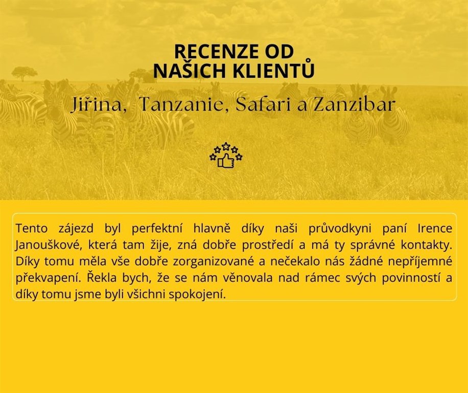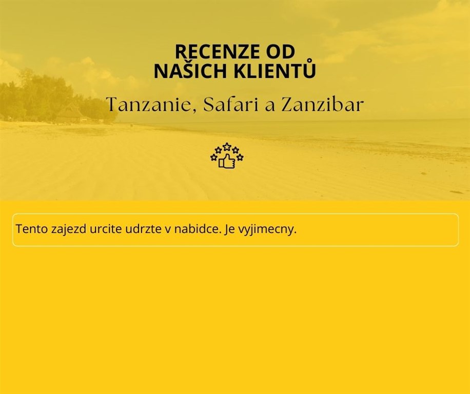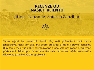 Cestovní dokladyVízum do Tanzanie se zajištuje na místě za poplatek 50 USD/osoba a platí pro Tanzanii i Zanzibar. Do země je nutný platný cestovní pas platný minimálně 6 měsíců po návratu.POZOR – při vstupu na letiště na Zanzibaru kontrolují LETENKY. Ty musíte mít vytištěné nebo uložené v telefonu. Bez letenky vás nevpustí na letiště.Při vstupu do Tanzanie se při příletu vyplňuje vstupní karta (obdržíte na letišti). Na Zanzibar je také nutné po příjezdu trajektem vyplnit vstupní kartu.BezpečnostTanzanie patří k bezpečnějším africkým zemím, zdravotnictví je na dobré úrovni. Přesto se doporučuje neprocházet se v osamocených místech a centrech měst po setmění, neupozorňovat na sebe nošením cenností (fotoaparáty, hodinky, šperky), osobní věci si dobře hlídat, a dávat si pozor na kapsáře.Měna a cenyNejlepší měnou v Tanzanii jsou dolary. Směnit si můžete přímo na letišti po příletu – cca 200 -300 USD na osobu. Kurz je cca 1 USD = 2300 TZS. Eura jsou také možná, ale obvyklejší je platit dolary.Jídlo v lepší restauraci s nápojem vychází kolem od 8 -13USD. Nápoje v restauraci – pivo cca 2 USD, koktejl cca 5USD, na hotelích bývají happy hours/sunset drinks – ceny o 50% levnější (3 USD od 17.00-19.00). Místní jídelny, nebo restaurace nabízí jídla od 2 USD.V Tanzanii se běžně platí tanzanskými šilinky (TZS) - Směnit lze bez problémů z dolarů, Eura lze taktéž směnit ve směnárnách. V neoficiálních směnárnách nebo na hotelu často berou kurz Eura jako 1:1 s americkým dolarem. Dolary můžete použít i při platbě suvenýrů, popřípadě vstupného do parků a safari výletů. Na směnu je lepší mít bankovky v hodnotě 50 a 100 USD, dostanete za ně lepší kurz. Menší bankovky 5-20 USD si nechte na placení suvenýrů nebo spropitného.POZOR: Při nákupu dolarů v ČR nebo ve světě si dávejte pozor, abyste dostali pěkné, neponičené bankovky vydané po roce 2006 – nejlepší je mít 100 USD bankovky s modrým pruhem. Starší bankovky bývá potom problém v Tanzanii směnit. V restauracích, obchodech a barech platíte v tanzanských šilincích.Peníze lze směnit na recepcích hotelů, ve směnárnách a v bankách. Banky si účtují menší poplatek od 2 do 4%.Platit kartou lze ve větších supermarketech (Shoppers, Aim Mall) anebo na hotelu. V curio shops (obchody se suvenýry) si kartu hlídejte. Běžně se užívá VISA, Mastercard.Spropitné: očekává se dle spokojenosti. Na safari běžně 10 USD/osoba/den pro řidiče, cca 5 USD den pro kuchaře, dává se na konci safari. Malé spropitné nosičům a pomahačům – 1 USD – lepší dávat v šilincích – 1000 TZS nebo 2000 TZS. Kapitán na lodi, průvodce po Kamenném městě očekává spropitné 10000 TZS. Celkově počítejte s výší utraceného spropitného 50 USD/osoba/zájezd. Tomu se nevyhnete, dýško se zkrátka očekává. Vhodné zavazadloJednoznačně doporučujeme dobrý batoh, do kterého se vám vše pohodlně vejde a který se dobře nosí. Kufr není pro tento zájezd vhodný.PočasíV únoru a březnu bude v Tanzanii počasí teplé. Přes den teploty do 30 stupňů. Na Zanzibaru očekávejte vysokou vlhkost, lepivost, teploty do 35 stupňů. Nejnižší teplota u kráteru Ngoro je cca 15 stupňů. Rozhodně je dobré přibalit s sebou lehkou mikinu či větrovku. Dlouhý rukáv také ochrání proti bodání hmyzem. OčkováníPro tento zájezd není žádné očkování vyloženě nutné. Při příletu z Evropy, pokud není přestup delší než 12 hodin (nebo po více než 6 dnech od opuštění endemické oblasti) není očkování proti žluté zimnici vyžadováno celními úřady. Žlutá zimnice se v Tanzanii ani na Zanzibaru nevyskytuje a pokud ano, jen velmi vzácně a jen v určitých oblastech. Požadavky země na povinnost očkování žluté zimnice se mohou měnit na základě uvážení místních orgánů. Doporučujeme cestovatelům před cestou do cílové země ověření informací na příslušném konzulátu nebo velvyslanectví. Očkování proti břišnímu tyfu není rovněž nutné, jelikož se budeme stravovat v místech s dobrým hygienickým standardem. Očkování proti žloutence typu A a B je možné zvážit, zvláště pokud často cestujete do jiných rozvojových zemí, jeho ochrana je dlouhodobá, až doživotní. Očkování proti onemocnění Covid-19 rovněž doporučujeme zvážit. Ostatní podrobné pokyny k zájezdu (tzv. rodokaps) obdržíte v dostatečném předstihu tak, abyste se mohli na zájezd v klidu připravit. Nejpozději však týden před odjezdem.